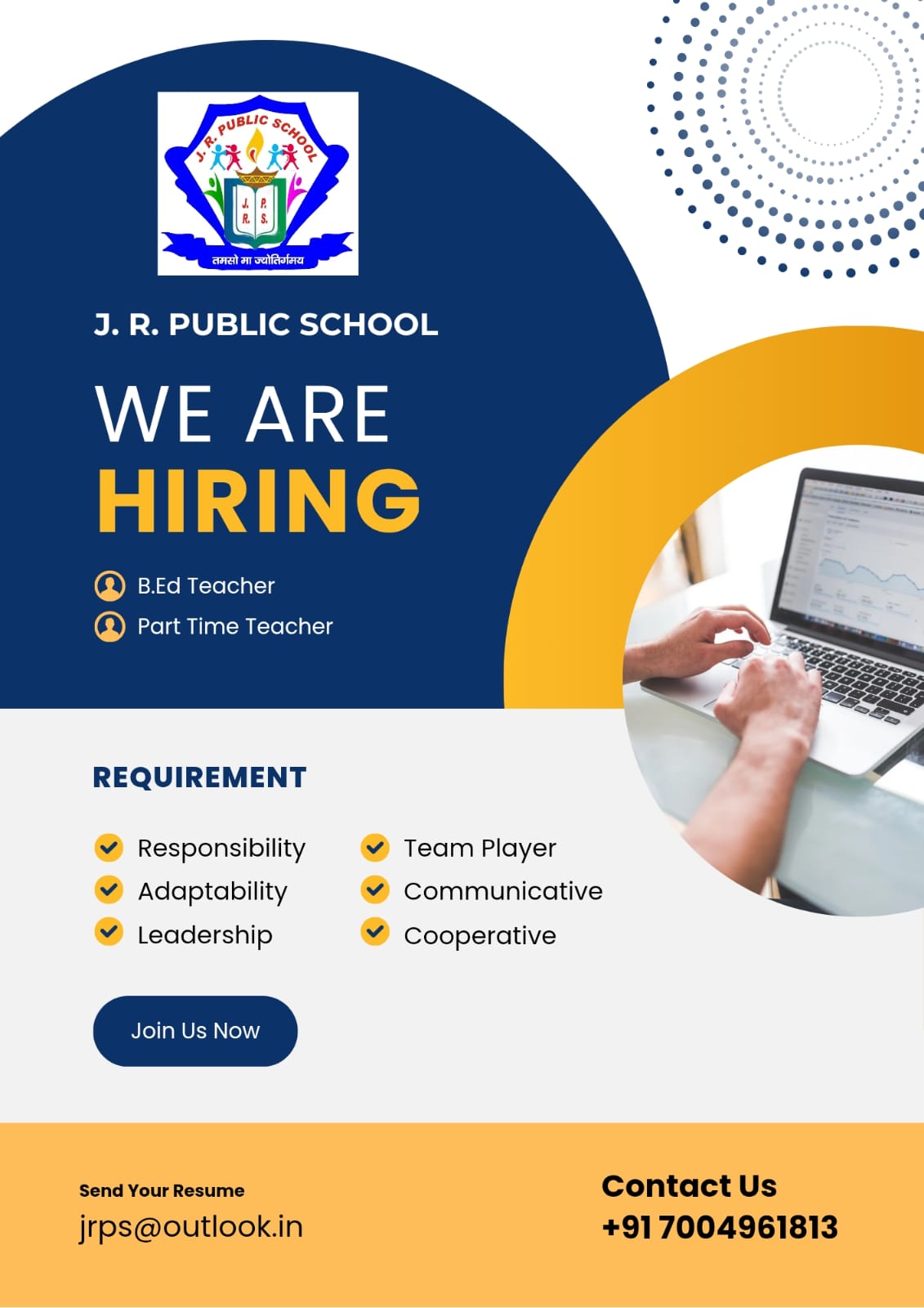 Join J. R. Public School – Where Education Meets Excellence Are you enthusiastic about shaping young minds and building the future of our nation? We are looking for dedicated, caring, and qualified teachers for Pre-Primary and Primary levels.